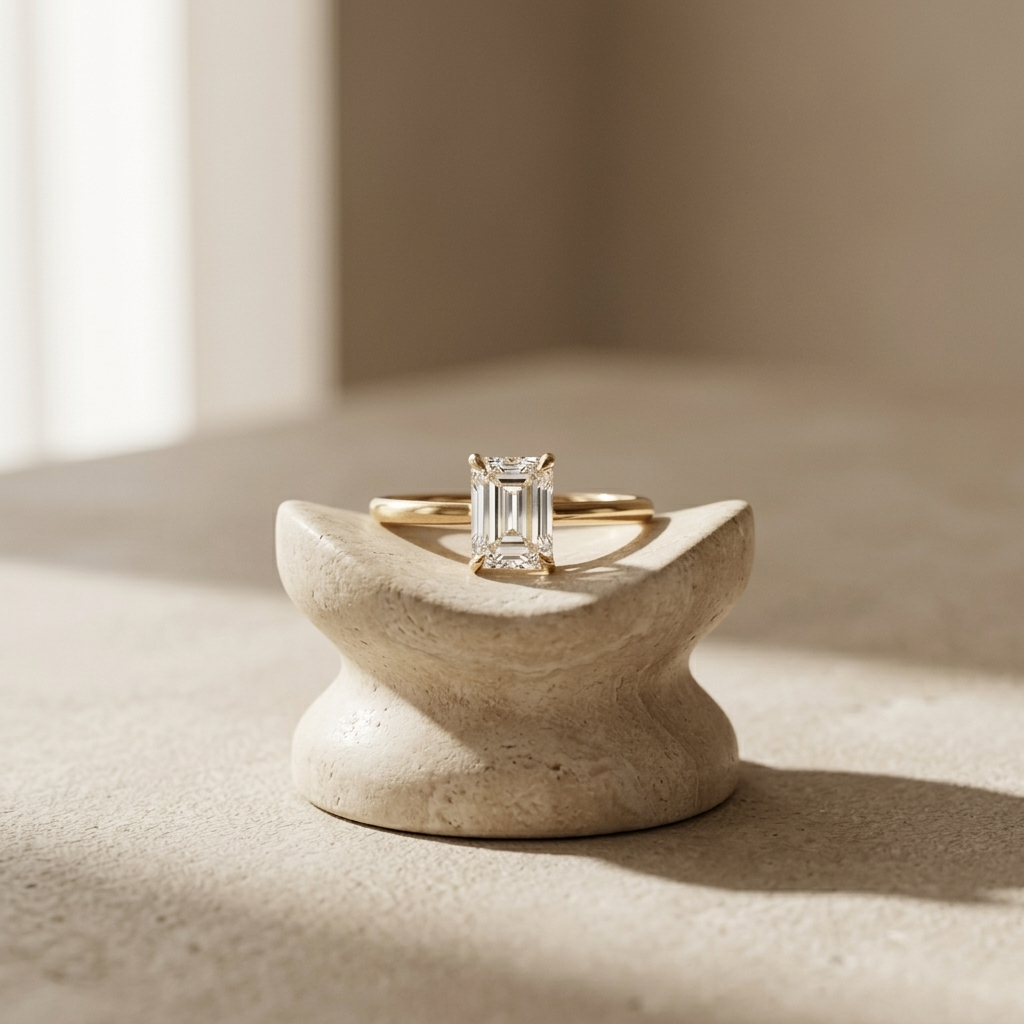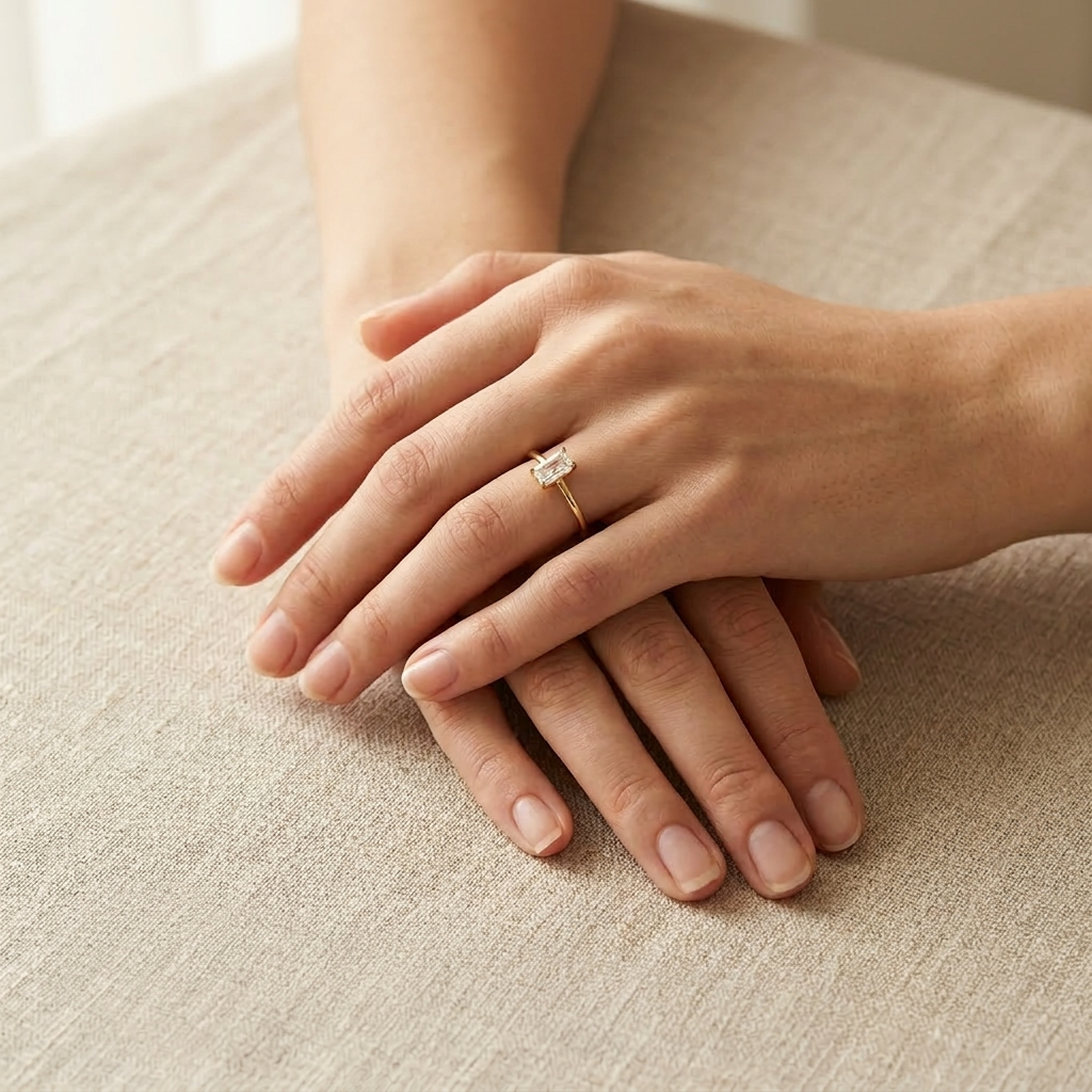 The Emerald Grace Ring captures timeless elegance with its radiant emerald-cut stone set on a delicate gold band. Designed with a minimal silhouette, it reflects light beautifully while remaining effortlessly wearable. This piece blends classic sophistication with modern simplicity — perfect for elevating everyday moments.
