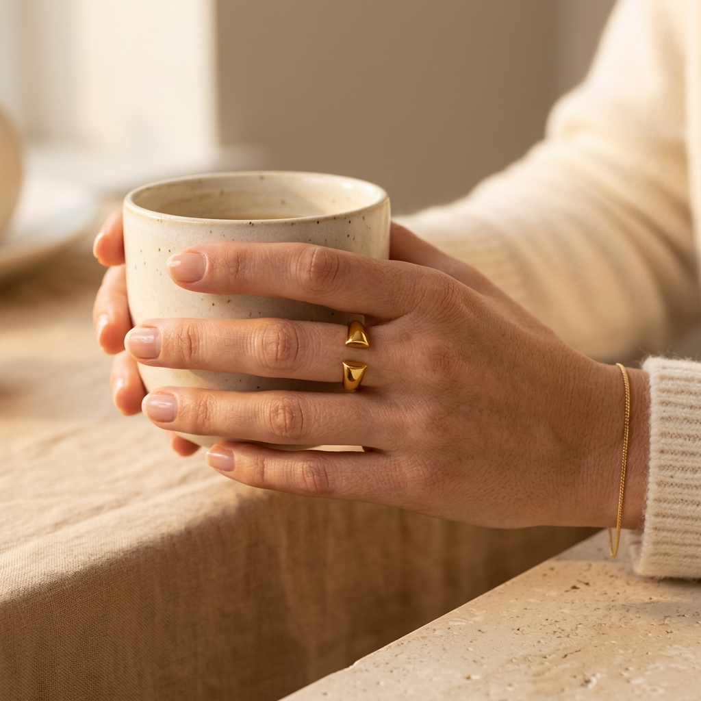 The Nova Open Ring features a sleek open silhouette finished with sculpted gold tips. Its contemporary design adds a subtle edge while maintaining an elegant minimal aesthetic. A versatile piece that pairs beautifully with both everyday and statement jewellery.